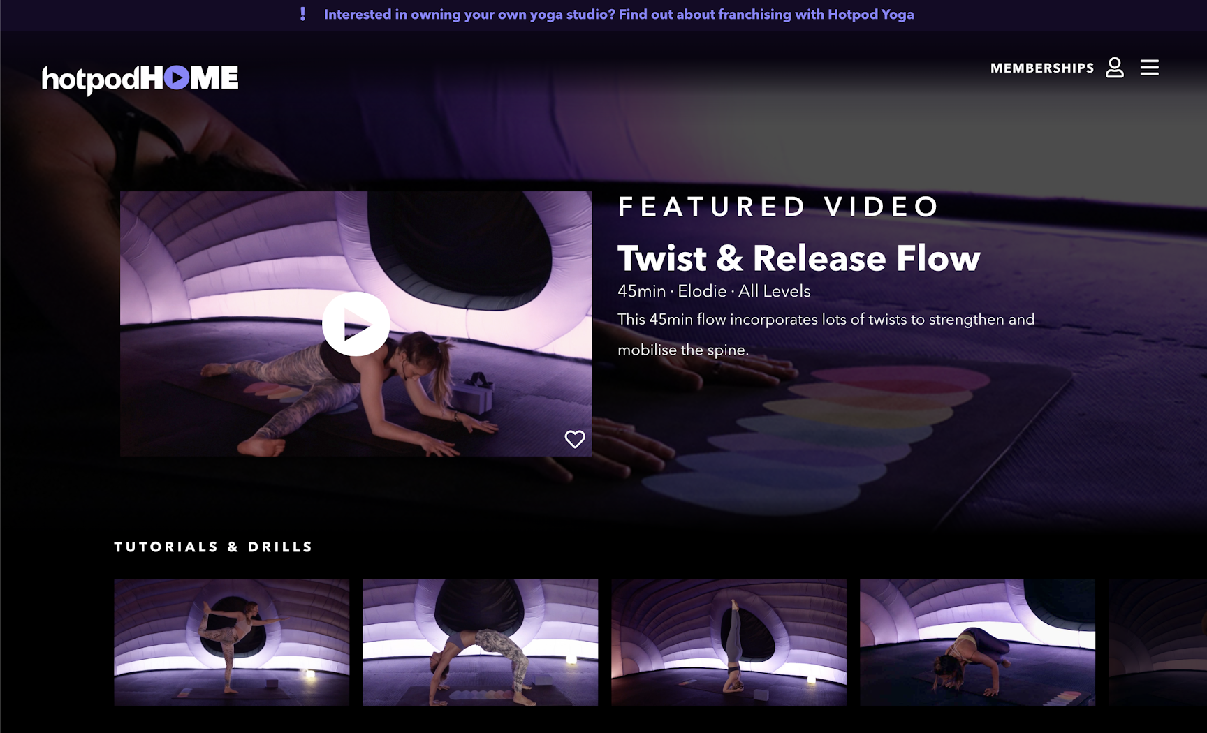 The project extended to encompass rapid development of Hotpod Home, a fully-online, video on demand (VOD) yoga class platform in response to the COVID-19 pandemic.